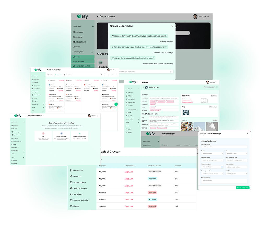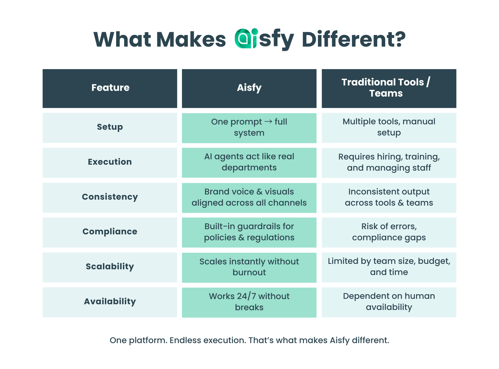Every Aisfy agent isn’t just automation — it’s a purpose-aligned, ESG-aware, regulation-ready AI team member. From marketing to compliance, each agent operates as part of a cohesive, brand-trained system that protects your values, governance, and growth.